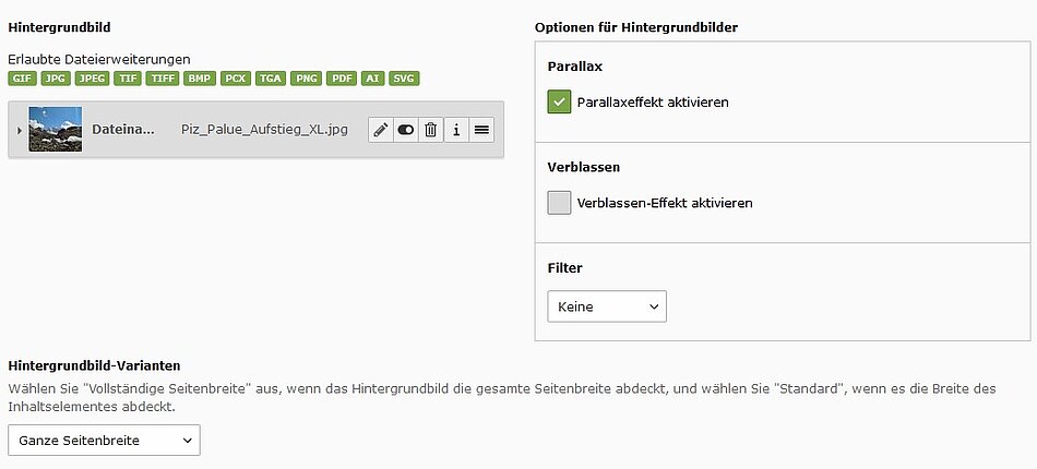 Wenn das Hintergrundbild sich über die ganze Seitenbreite erstreckt, so kann "Ganze Seitenbreite" als "Hintergrundbild-Varianten" ausgewählt werden. Damit wird die Bildauflösung angepasst.