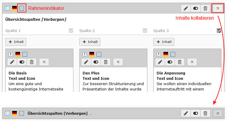 Für eine bessere Übersicht bei der Inhaltsverwaltung wurde ein Rahmenidikator sowie eine Kollabier-Funktion hinzugefügt. Der Rahmenidikator zeigt an, ob bei einem Inhaltselement ein Rahmen verwendet wird und die Kollabier-Funktion erlaubt es Inhaltselemente auf die Kopfzeile zu reduzieren.