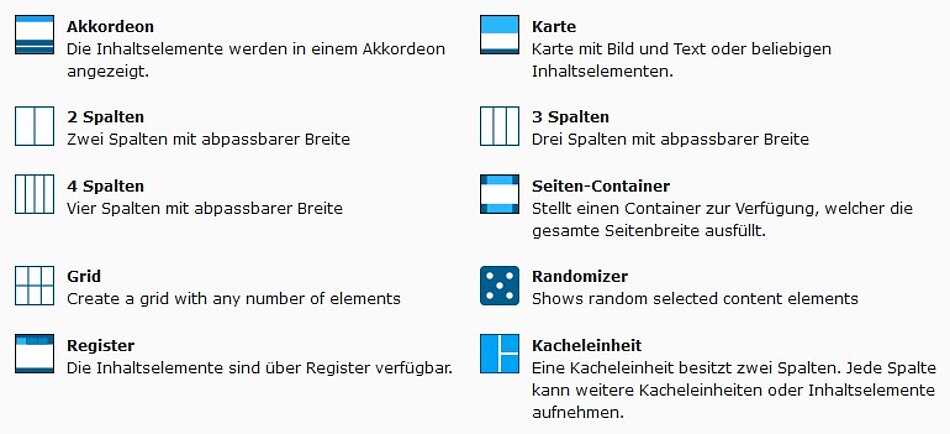 Mit Strukturelementen können Seitenbereiche feiner unterteilt werden. Typische Strukturelemente sind Spalten, Grid, Container, Register und Akkordeon.